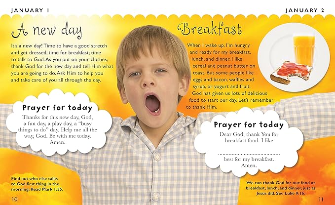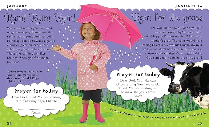 Through familiar childhood situations, children are encouraged to think about what God is like, how he cares for them and how he wants them to live in his world. A short Bible passage for parent and child to read together supports the day’s message and a prayer helps children develop their own relationship with God.