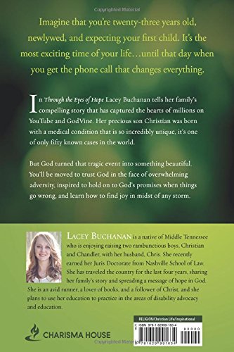 In Through the Eyes of Hope Lacey Buchanan tells this compelling story of trusting God in the face of adversity. You will be moved and inspired to hold on to God's promises when things go wrong and find joy in midst of any storm.