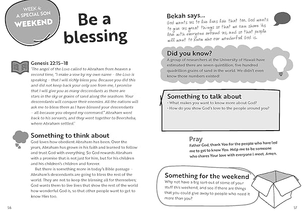 Each day includes a short Bible passage, some ideas to jump-start the conversation, thoughts to ponder, real-life anecdotes and some weird and wonderful facts, topped off with a simple prayer. Weekends have a bonus suggestion of fun ways to connect and even impact your sphere of influence - whatever your family looks like!